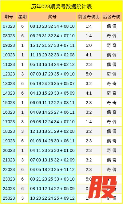 后区二球:在历史第023期同期开奖中,后区二球的奇偶比为8:11,最近5年后区二球奇偶走势为:奇数、偶数、偶数、奇数、偶数,今年预计后区二球开出奇数号码,参考后区二球为07。